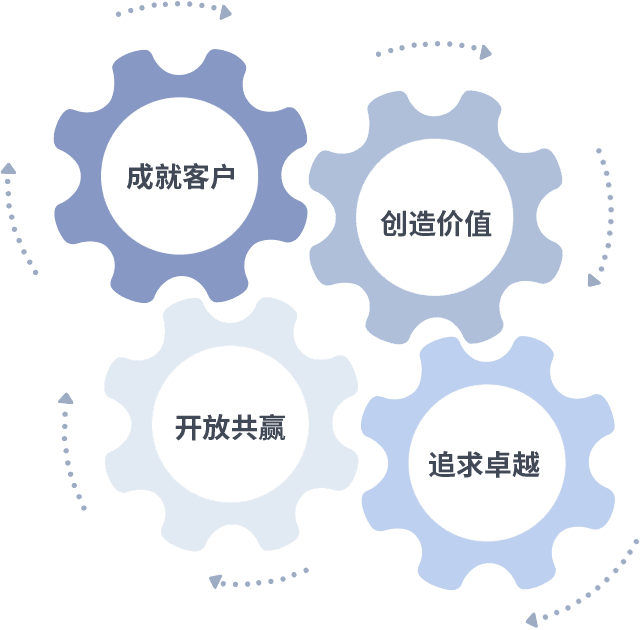 成就客户是一切决策的出发点,,创造价值是衡量所有工作的标准,,,追求卓越是我们做事做人的态度,,开放共赢是我们的格局也是最终的结果。。价值观的齿轮环环相扣,,推动着组织里的每个人不断向前。。